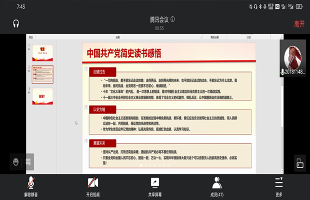 2021年8月15日晚7:30,地学学院本18级第二党支部通过腾讯会议开展“暑期自学读书班”活动。本次会议由宋盼盼同志主持,党支部全体成员参加。