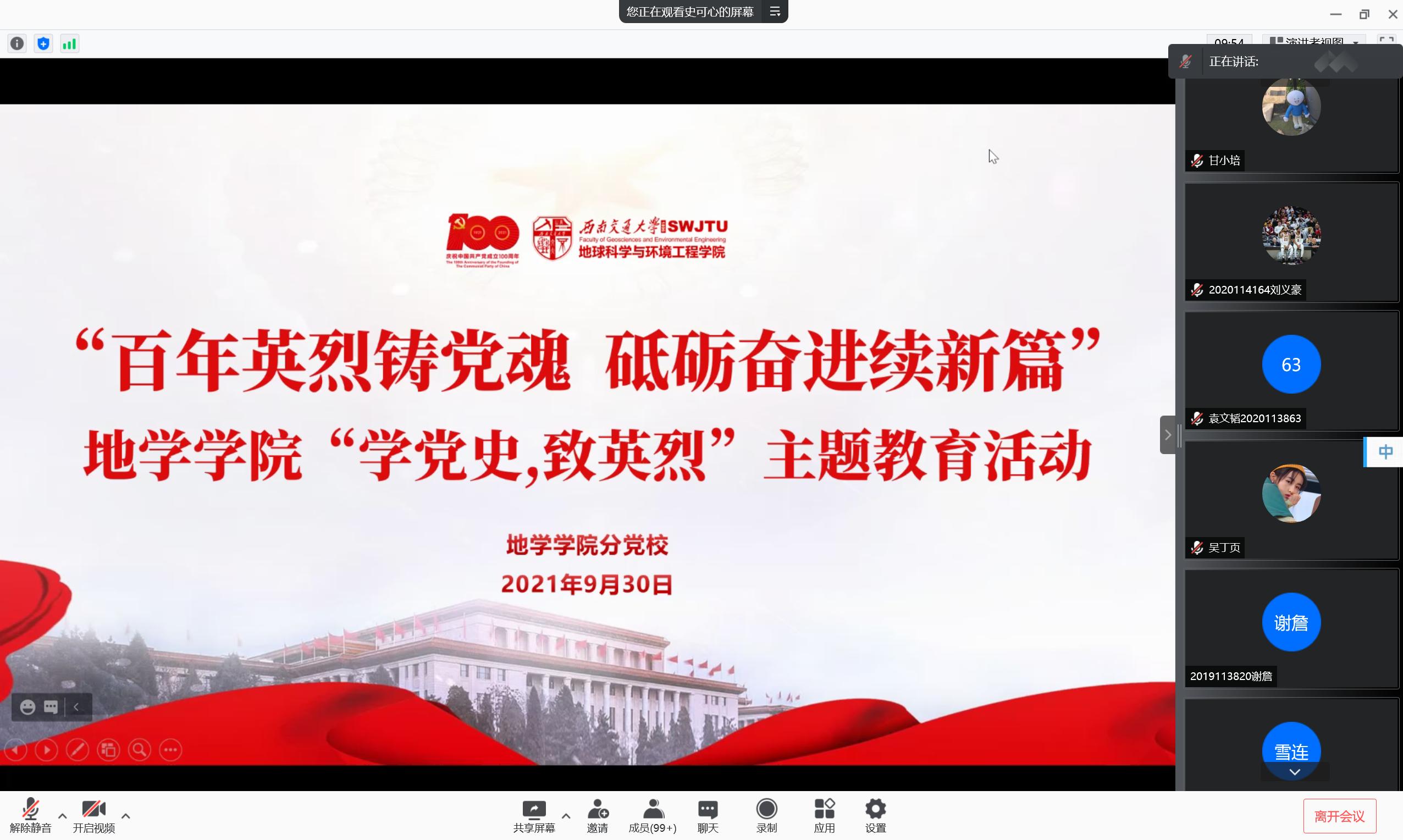 2021年9月30日,是我国第八个“烈士纪念日”。为推进党史学习教育走深走实,深刻缅怀英雄的丰功伟绩,颂扬传承先烈的崇高精神,激励党员、积极分子进一步坚定理想信念,切实提高党员发展的质量。地学学院分党校于9月30日下午18:00通过腾讯会议线上开展“百年英烈铸党魂,砥砺奋进续新篇”——“学党史·祭英烈”主题教育活动,本次活动由地学学院分管学生党建的史可心老师主持,学生党建负责人文强老师和290余名预备党员、入党积极分子参加。