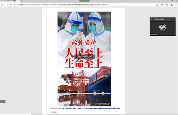 为了使支部党员正确认识当前疫情防控形势,服从学校疫情防控工作安排,2022年4月14日晚,研20级环境三班党支部通过腾讯会议组织学习了《习近平总书记指挥打好统筹疫情防控和经济社会发展之战述评》。