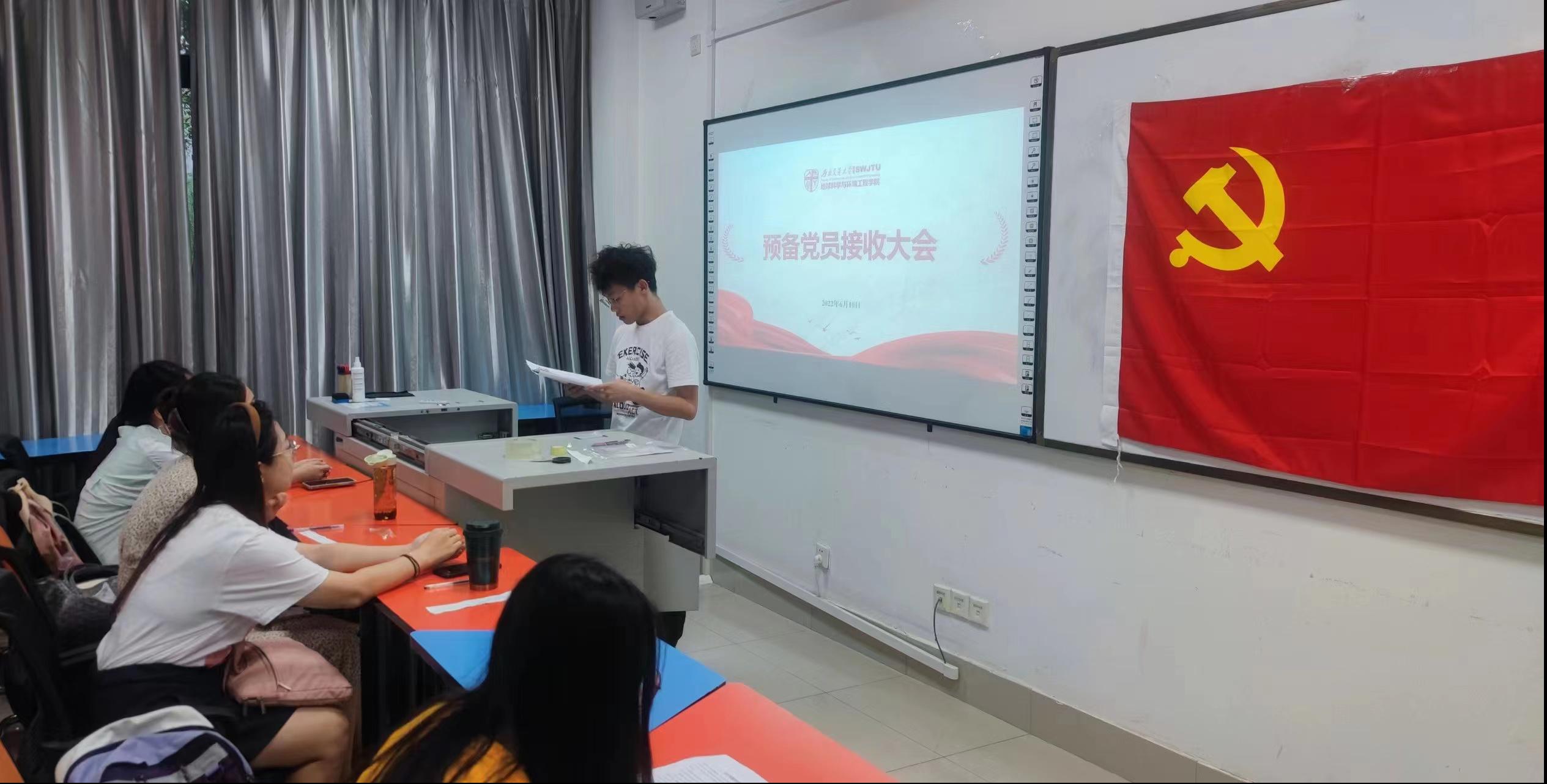 2022年6月10日晚,研20级环境三班党支部于犀浦X4131教室开展了预备党员接收大会,本次讨论的是本支部杨含铭同志的接收问题。大会主持人罗越扬同志清点到会人数,宣布大会的议题和拟接收入党同志的名单后,杨含铭同志汇报个人情况,他分别从对党的认识、入党动机、个人情况、入党的决心以及需要向党组织说明的问题等方面进行汇报,杨含铭同志表示将争做合格党员作为自己一生的事业,坚持以党章中规定的党员标准严格要求自己,积极发挥党员的先锋模范作用,切实践行“全心全意为人民服务”的宗旨。