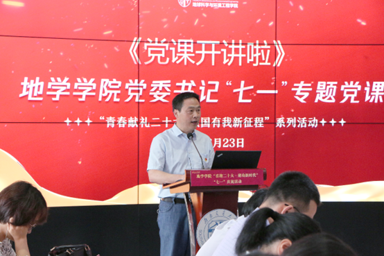 为庆祝中国共产党成立101周年,迎接党的二十大胜利召开,继承和发扬党的光荣传统和优良作风,增强党组织的凝聚力和向心力,6月23日下午,地学学院于X4243、X4520会议室举行“喜迎二十大·建功新时代” “七一”庆祝活动。学院党委书记关秦川、党委副书记、副院长许军华出席活动, 2021-2022学年“两优一先”表彰的党员代表以及2021年下半年发展的全体学生党员参加了此次活动。活动由学院党委副书记傅尤刚主持。