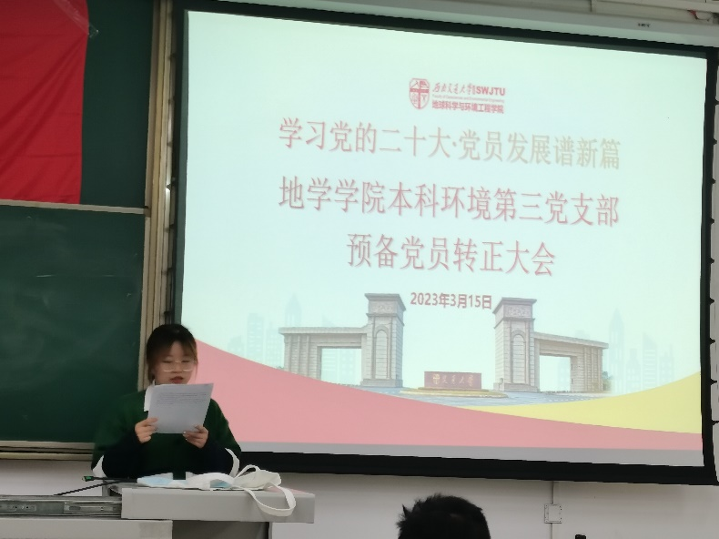 注入新血液,凝聚新力量。地学学院本科环境第三党支部于2023年3月15日 19:30在X2213召开预备党员转正大会,本次会议由代雅姗同志主持。