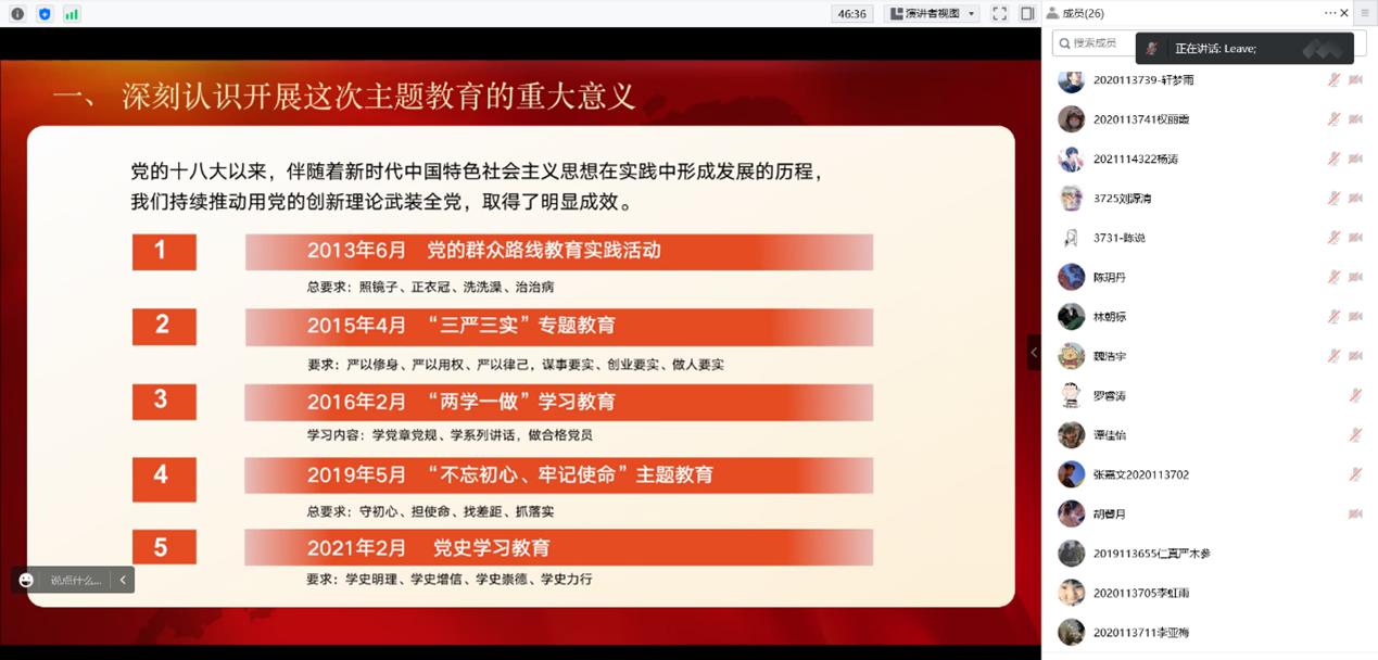 最后,刘烨同志进行总结发言,希望全体党员同志都能深刻认识到主题教育的重要性,认真对待每一次主题教育,不断提高思想觉悟。
