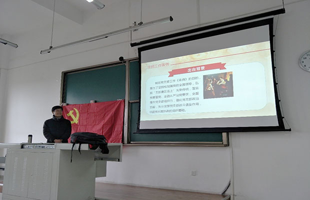 11月29日下午15:50,学习《中国共产党支部工作条例(试行)》的会议在X9505教室成功召开,出席本次会议的是研17级地质一班、二班、三班和研17级环境一班、二班、三班的党支部书记、委员、以及全体共产党员和入党积极分子。主讲人是地质工程系赵晓彦老师,赵老师就《中国共产党支部工作条例(试行)》的相关内容进行讲解,并与各位党员同志共同学习。