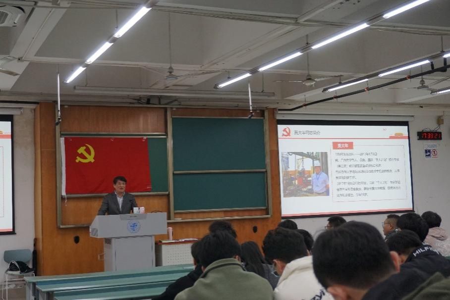 2023年11月22日,地学学院党委胡卸文教授在犀浦校区X4350教室为博士地质党支部、研22、23级地质第一、第二党支部的同学们讲授了一堂名为“学习英雄地质队,不忘初心勇担当”的专题党课。党课内容主要包括三部分:学习习近平给山东省地矿局第六地质大队全体地质工作者的回信精神,学习李四光精神,以及学习黄大年精神。
