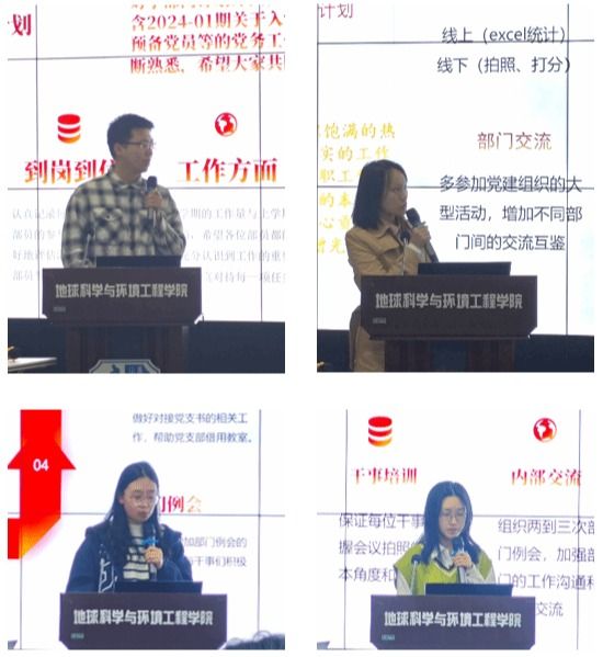 随后,各部门部长及干事上台总结上学期工作及本学期规划。学习部计划本学期认真记录到岗部员的参与,加强部员充分认识到工作的重要性;监管部提出要多参加党建组织的大型活动,增加不同部门间的交流借鉴;活动部同地学青协商量将由地学学院党建事务中心接管方碑社区公益课堂,并将面向党建事务中心全体同学进行招募,加强对活动的规划和管理;宣传部计划本学期保证每位干事掌握会议拍照角度和要求,组织两到三次部门例会,加强部门的工作沟通与交流。