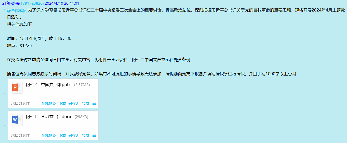 在主题党日活动开始前,组织委员已在支部群上传了活动的学习资料,以供提前学习,并鼓励党员们充分利用这些学习资料,深入了解活动内容,为活动的顺利进行做好充分准备。