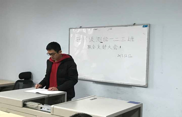 2017年12月12日上午,在学院组织员刘冠军老师的指导监督下,我地学学院研16级测绘一、二、三班三个支部联合举行了支部大会,分别独立讨论了各支部内预备党员的转正问题及发展对象的入党问题。