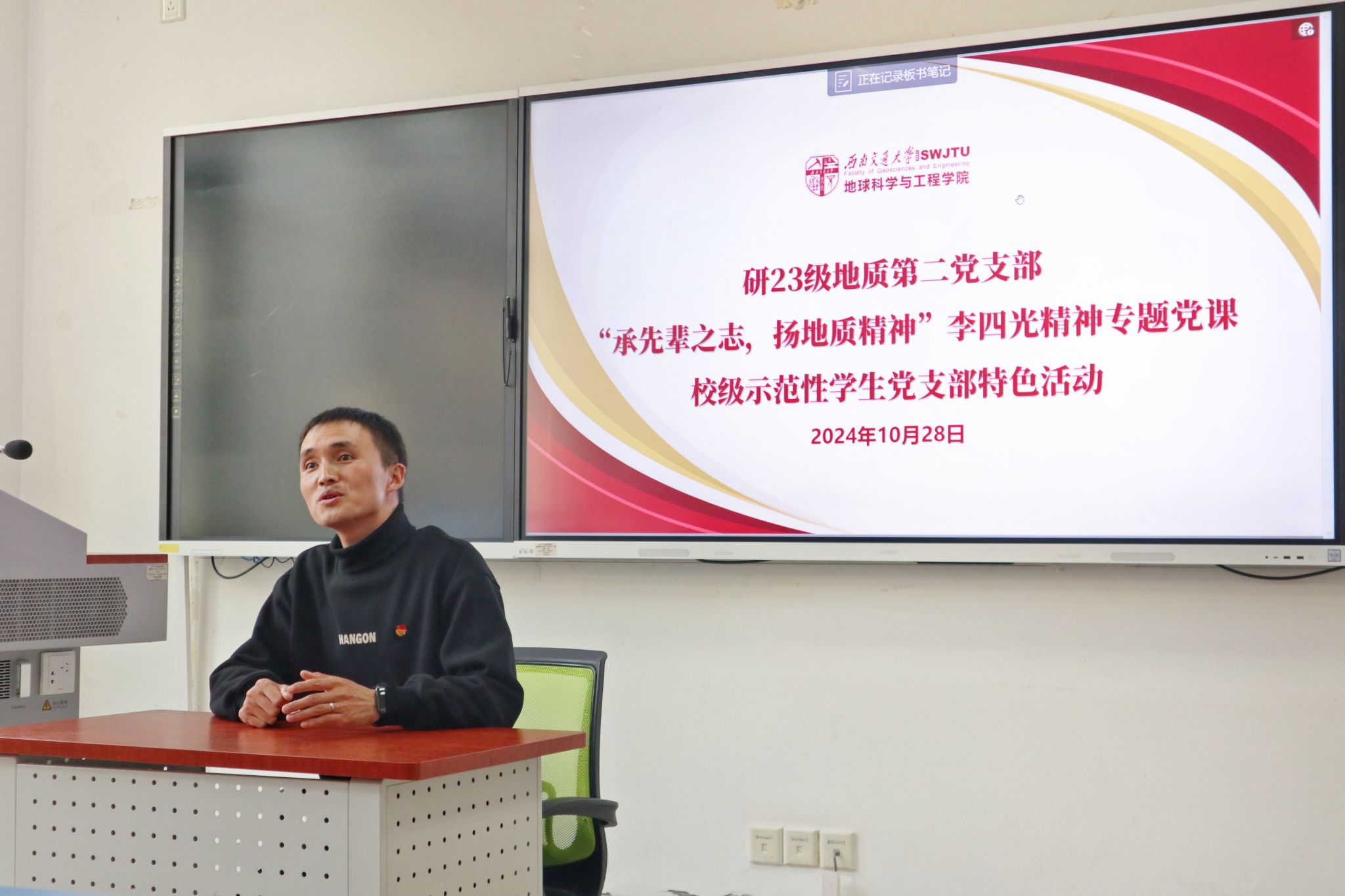 青年讲师团成员杨洋同志为研23级地质第二党支部的成员们带来了一场生动的专题党课。杨洋同志围绕“承先辈之志,扬地质精神”的主题,深情讲述了地质学家李四光先生的光辉事迹和崇高精神。