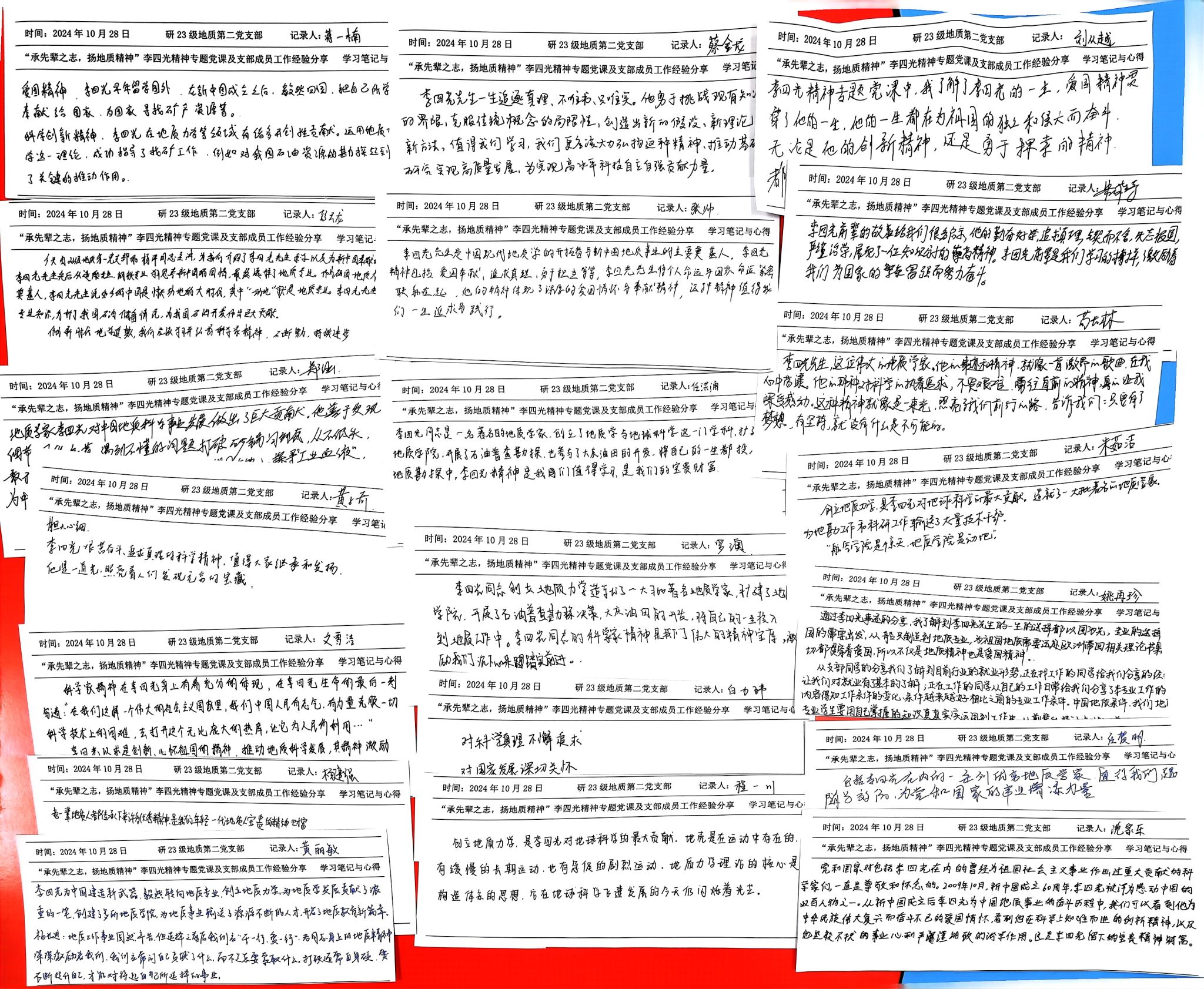 党课结束后,支部成员们深受激励,纷纷写下了自己的心得体会。大家纷纷表示,要更加深刻地理解李四光精神的内涵和价值,更加坚定自己为地质事业奋斗的信念。
