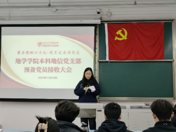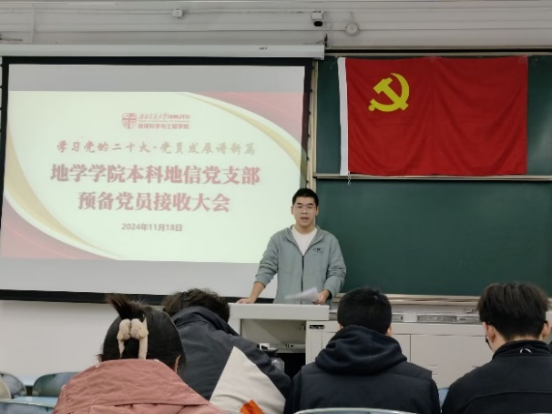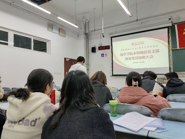 为进一步加强党支部队伍建设工作,切实提高党员发展对象综合素质,严把党员发展质量关,充分发挥党员先锋模范作用和党组织战斗堡垒作用,地学学院本科地信党支部于2024年11月18日晚上19时00分在X2331召开2024-02期预备党员接收大会,本次大会的议题:讨论是否同意接收黄龄诺、石嘉馨、王艺诺、张智睿4名同志为预备党员。本次大会由候王悦同志主持。