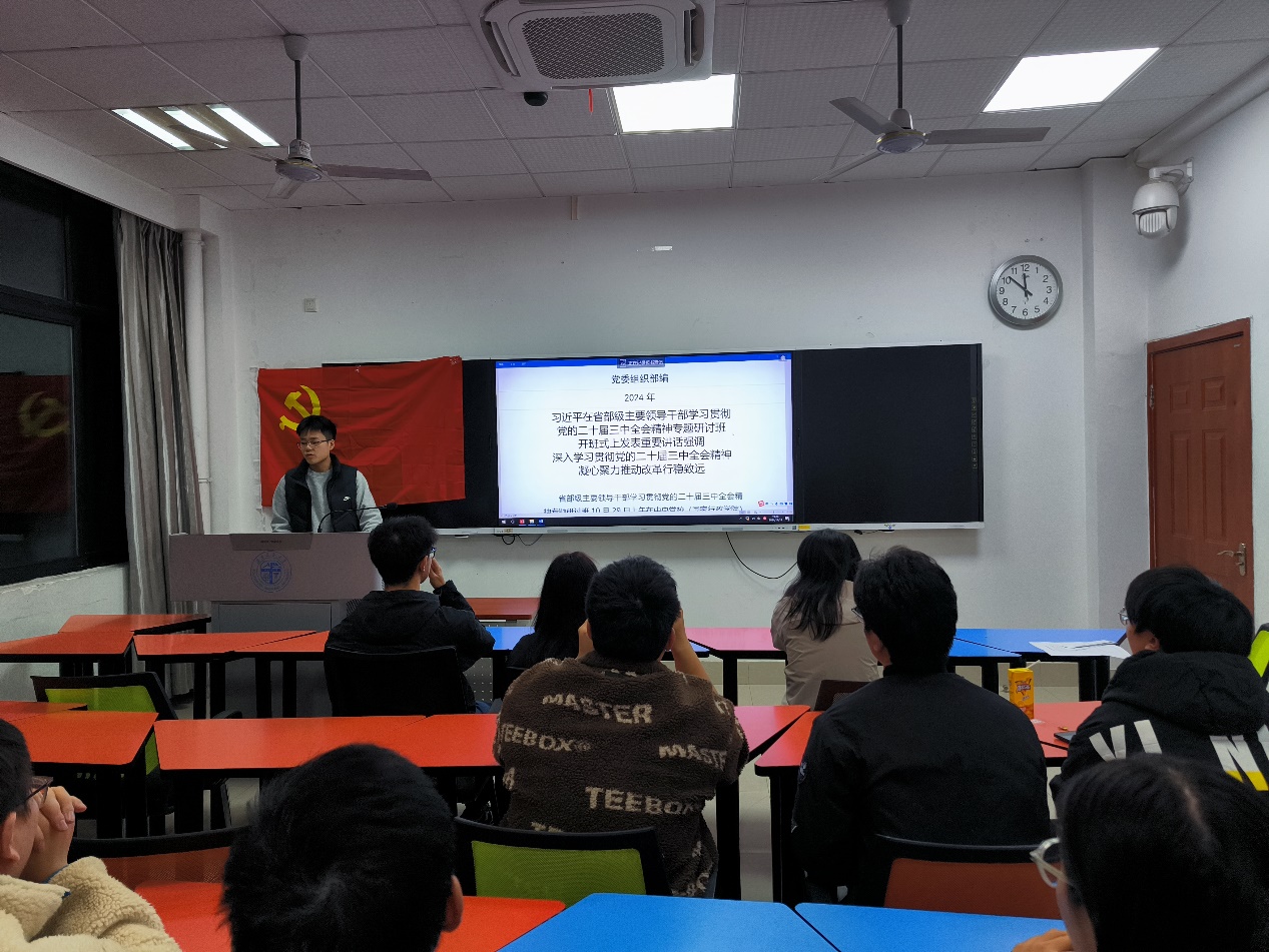 首先,在党支部书记刘翔同志的带领下,大家集体学习了习近平总书记在省部级主要领导干部学习贯彻党的二十届三中全会精神专题研讨班上的重要讲话精神和习近平总书记在中共中央政治局第十七次集体学习时的重要讲话精神。通过学习,大家纷纷表示,对于我们研究生党员来说,我们要把学习贯彻党的二十届三中全会精神不断引向深入,增强担负建设文化强国的使命感。