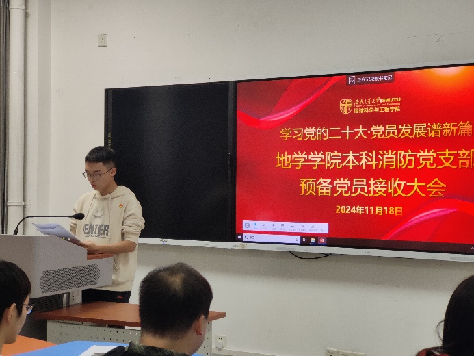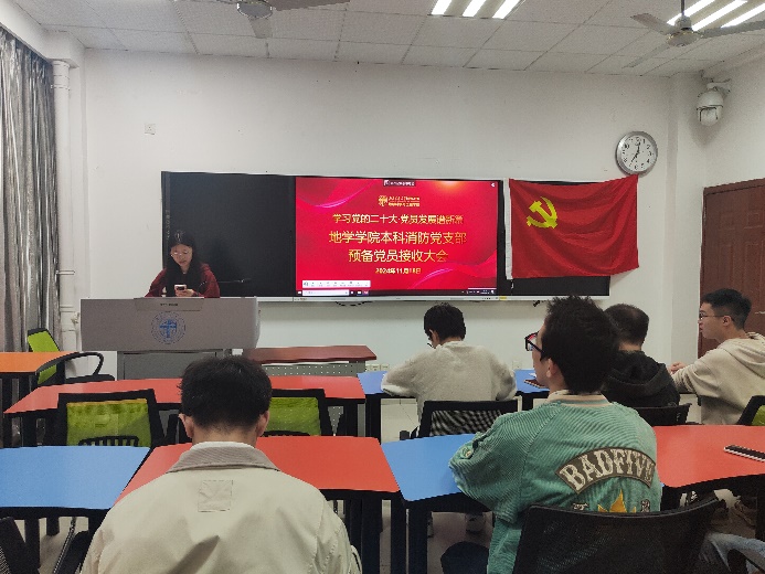 为了切实做好2024年发展党员工作,进一步提高党员队伍的素质与活力,提升党员发展质量,本科消防党支部于2024年11月14日在X4136教室举行了一次预备党员接收大会。此次大会的主要议题是讨论接收周爽、付君洋和李其钟三位同志为中共预备党员的相关事宜。