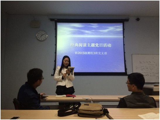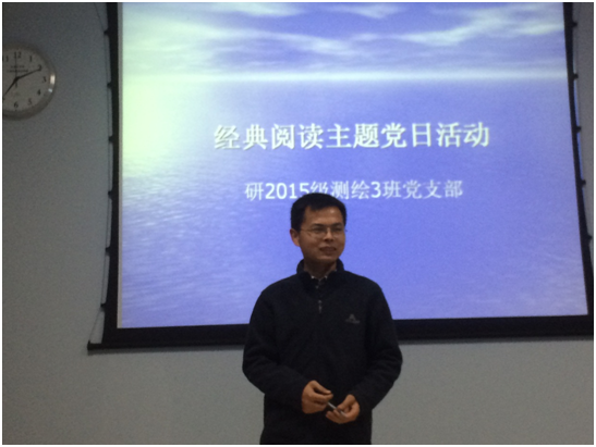 对于每个党员而言,向书本学习必须做到“专心”。党员加强学习,其中读书学习是一条重要的渠道。没有知识,没有文化,怎么提高为人民服务的本领,又怎能发挥党员的先锋模范作用。党员必须加强学习,不学习就会落伍,不学习就会被淘汰。2015年11月20日,2015级测绘三班党支部开展了“经典阅读”主题活动,会议由测绘三班班党支部书记上官磊主持,主要有以下四个部分: