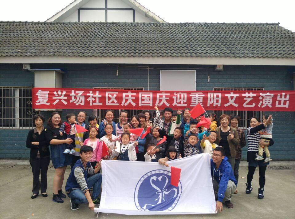 为期四天的服务活动,地学学院服务队的队员们陪着他们从春眠不知晓读到离离原上草,从洗澡歌唱到拔萝卜。科普课上,队员们更是手把手的教会了孩子们体温计的使用……两天多的时间里,服务团队也在迅速成长,从最初的手忙脚乱到从容的面对各种状况,自身社会实践和志愿服务能力也再提高。10月5日上午,写有“复兴场社区庆国庆迎重阳文艺汇演”的红色横幅鲜艳夺目,由孩子们,家长们准备的节目轮番登场,虽然准备的时间很短,节目也并不是很精致,气氛却出奇的好,掌声中氤氲着温情。最后,六名志愿者以一首《朋友》收尾,“朋友一生一起走,那些日子不再有,一句话,一辈子,一生情,一杯酒”,志愿者队员们和孩子们是朋友,与年龄无关,以爱之名,志愿者们以青春筑起友谊的桥梁。