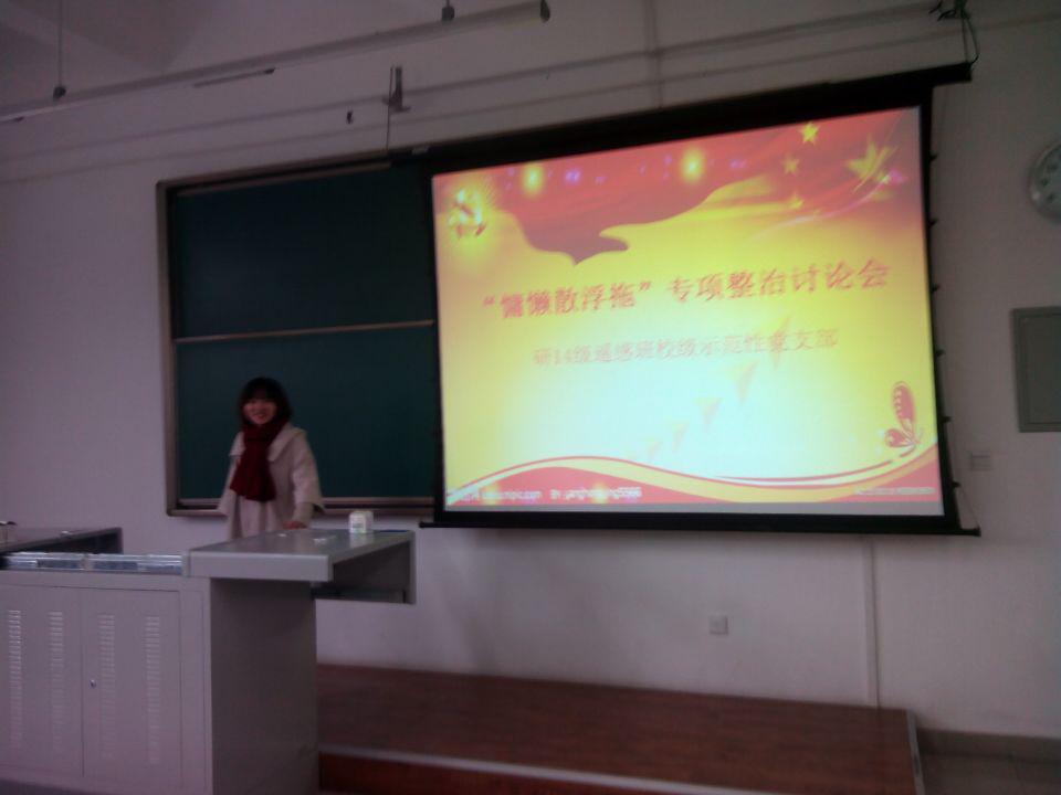 研14级遥感班校级示范性党支部分别于2014年11月27日、12月6日、12月18日举行十八届四中全会学习讨论会、《习近平总书记党的群众路线教育实践活动总结大会上的讲话》学习讨论会以及“慵懒散浮拖”专项整治讨论会。此次专题交流活动吸引三十余名同学参与其中。