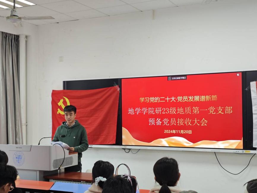 为做好2024年发展党员工作,切实提高党员发展质量。研23级地质第一党支部于2024年11月20日16:00在X4132召开2024-02期预备党员接收大会,本次会议由党支部书王睿同志主持,支部党员、发展对象、入党积极分子和入党申请人总计22人与会。