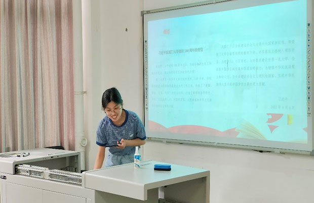 随后第三小组成员吴昌浩同志带领全体参会同志深入学习了以厦门大学杰出校友为例展现出来的“爱国”精神和“科学”精神。纵观厦门大学的百年发展史,爱国、报国都蕴含在其文化基因中,成为其一脉相承的精神财富。像王亚南校长、陈景润教授那样投身科学事业的楷模,他们影响着一代又一代的中国学子。吴昌浩同志呼吁我们作为年青一代的我们更要如他一般将爱国之情融入血脉,把“勿忘国耻、奋发图强”永远铭记,同时也要学习厦大人秉承着“顶天立地做科研,服务社会促发展”的理念,潜心研究,勇攀科学高峰,在服务社会中书写担当的精神。