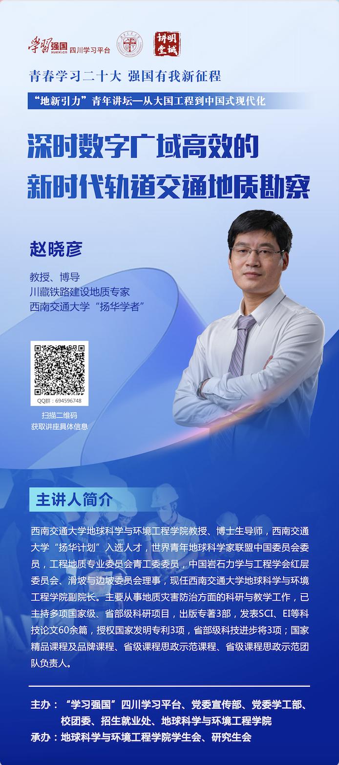 为学习宣传贯彻党的二十大精神,充分发挥学校轨道交通相关学科优势,引领广大青年学生将小我融入大我,以青春实践奉献祖国,在新时代新征程中奋勇争先建功立业,使青年一代在大国工程一线受教育、长才干、做贡献。地学学院在“学习强国”四川学习平台、党委宣传部、党委学工部、校团委以及招生就业处的支持下,邀请了大国工程一线以及思想政治教育与人文社科领域的专家、学者、教授为主讲嘉宾,通过“地新引力”青年讲坛的方式,为青年学生解惑授业、增知识、长才干,号召广大学生立志做有理想、敢担当、能吃苦、肯奋斗的新时代好青年。2023年5月4日,值此青年节之际,“地新引力”青年讲坛——“从大国工程看中国式现代化”开讲仪式暨专题一、专题二讲座即将开始,现就相关通知如下: