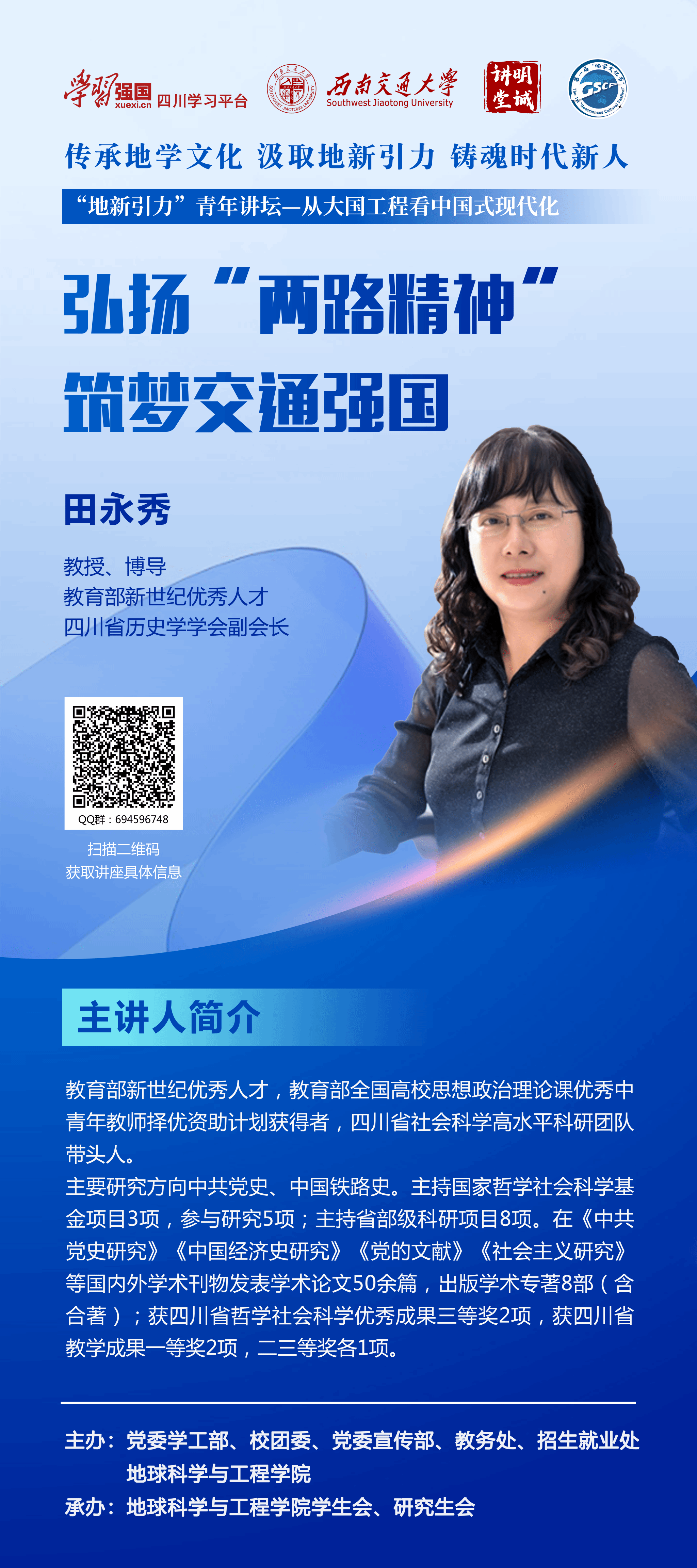 2.“地新引力”青年大讲堂——“从大国工程看中国式现代化”系列讲座既是思政教育,同时也是学术殿堂。本期讲座采取线下的方式进行(线下讲座容量为350人),同时活动也设有活动QQ群:(694596748)。