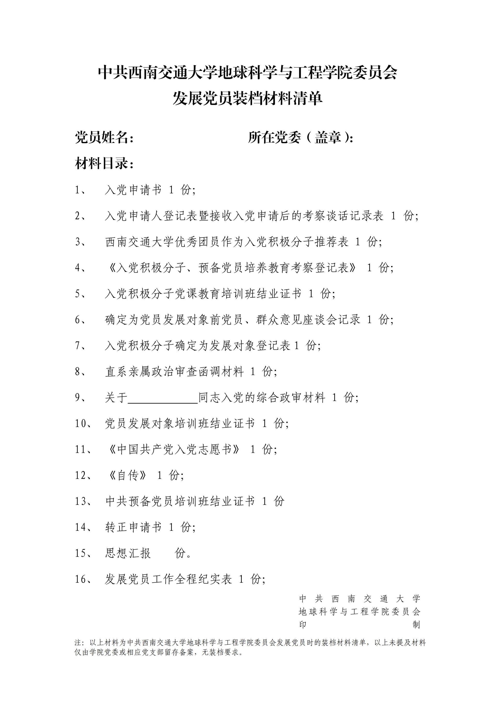 【地学版本】正式党员装档材料清单样例: