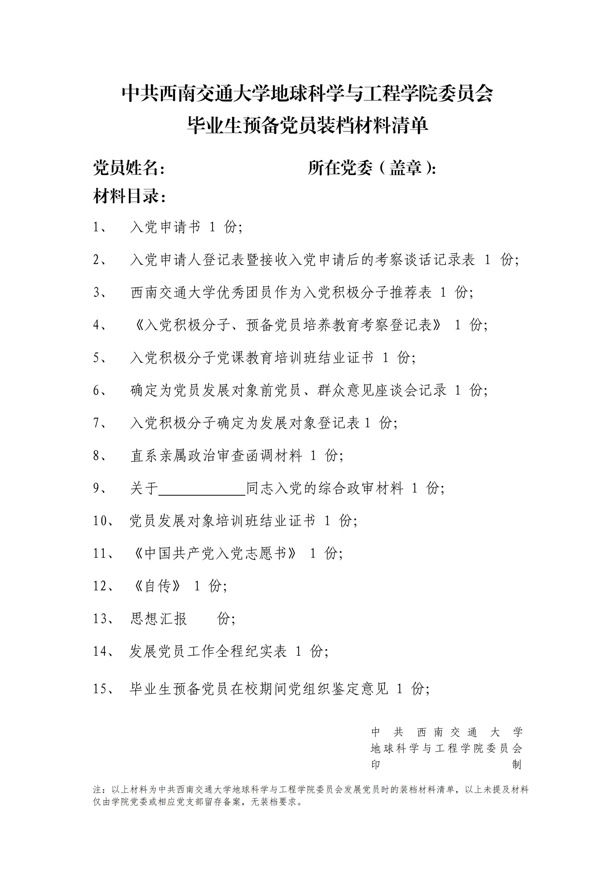 【地学版本】毕业生预备党员装档材料清单样例: