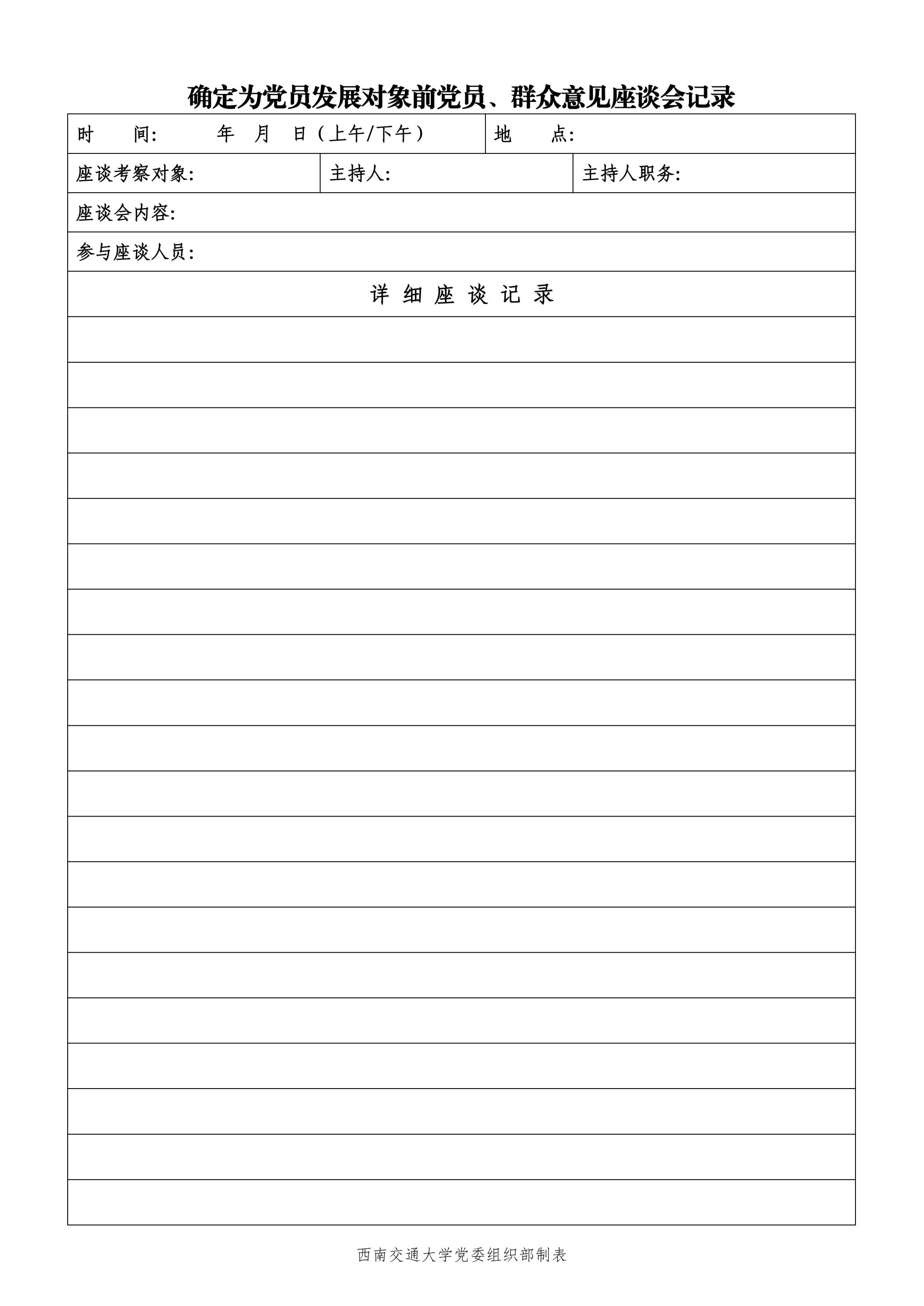 此份文件为2024年3月前使用的旧版文件,2024年3月1日及之后确定为发展对象的同志请跳转链接参照新版座谈会记录表: