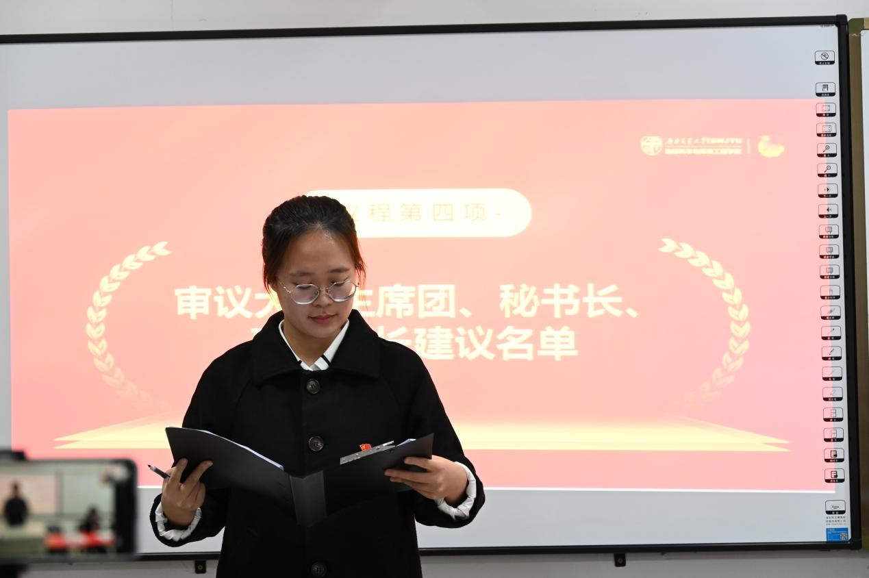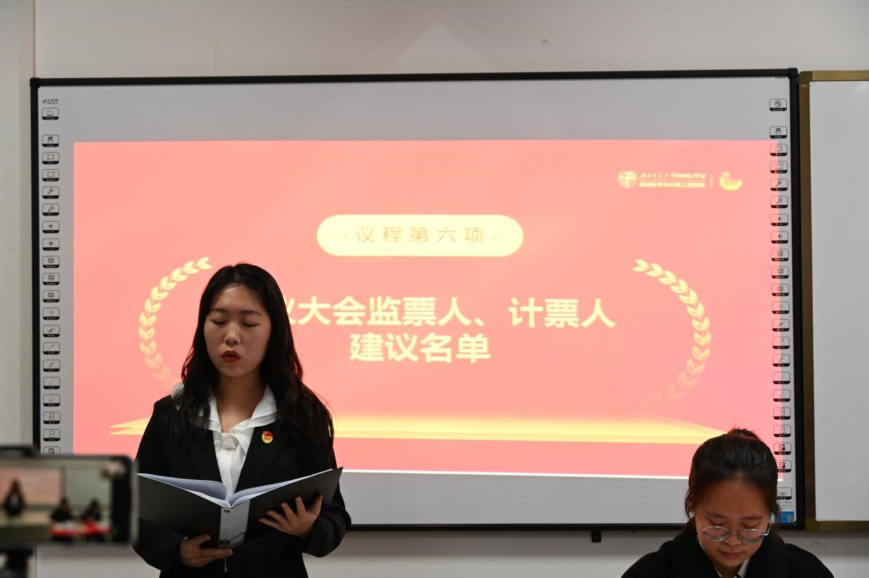 会议第六项,由胡佳慧宣读大会监票人、计票人建议名单,第十二届学生委员会候选人名单以及第十二届学生会主席团候选人名单。经各代表审议通过。