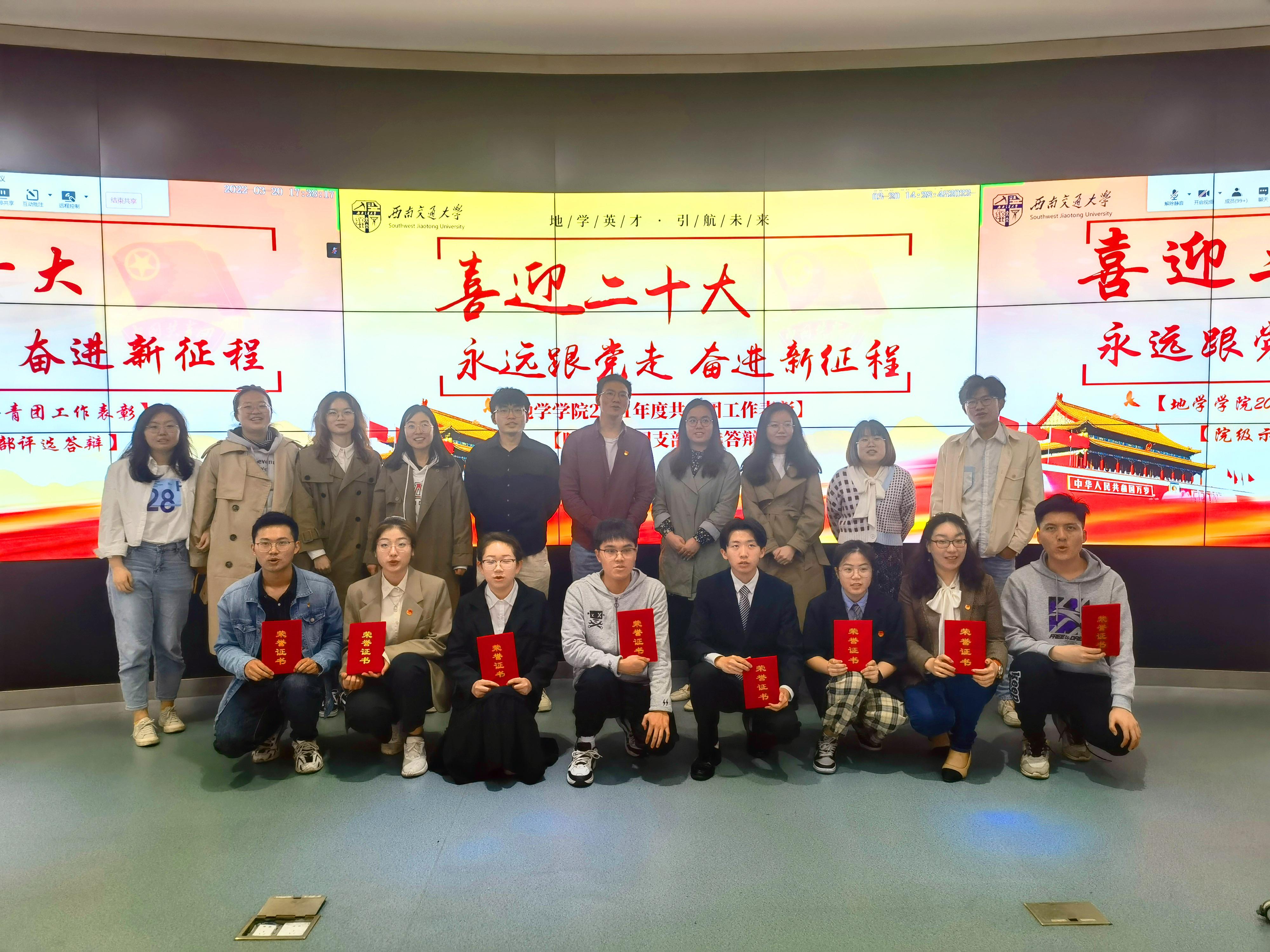 最后,杨都强书记为获奖团支部颁发了荣誉证书,各获奖团支部代表与本次答辩会各位评委老师合影留念。