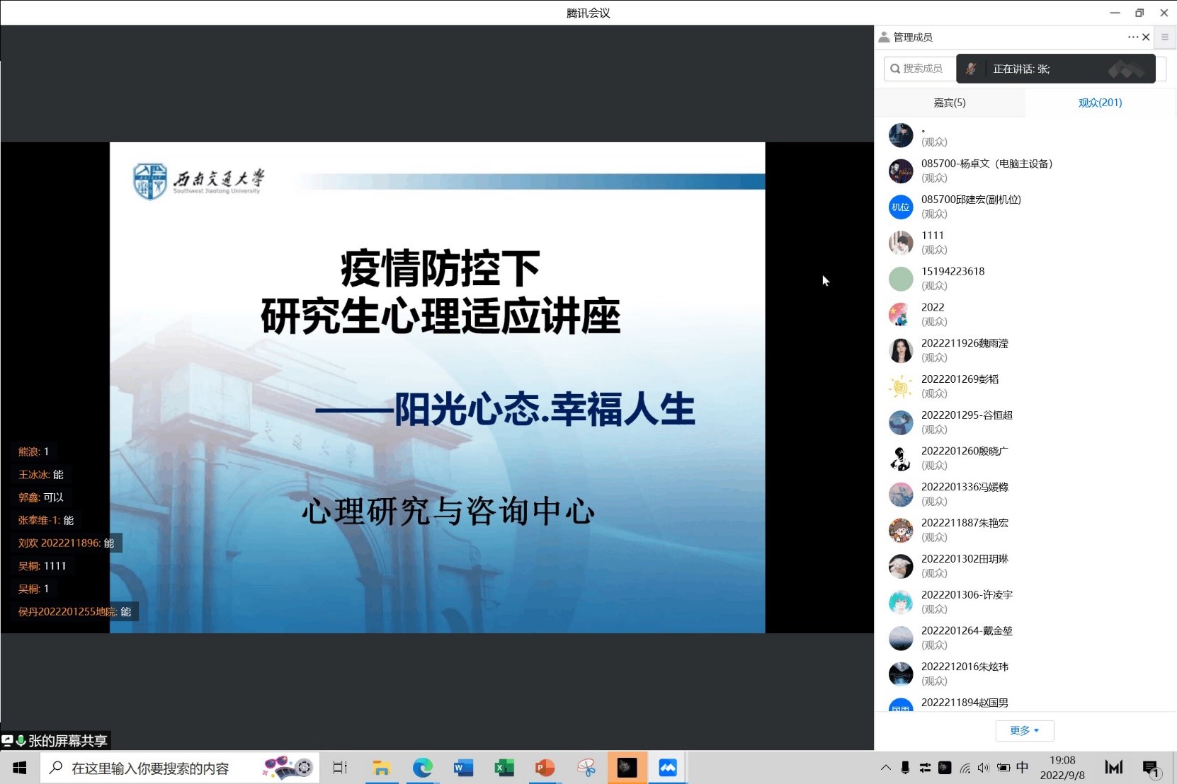 为做好研究生新生心理健康教育工作,帮助全体研究生新生关注自身心理健康和心灵成长,提高心理调节能力,2022年9月8日晚上19:00,地学学院通过腾讯会议举办了以“阳光心态,幸福人生”为主题的心理健康教育讲座。此次讲座由心理研究与咨询中心的张涛老师主讲,2022级研究生辅导员崔宇龙老师主持,分管学院心理工作的史可心老师和2022级全体研究生新生参加。