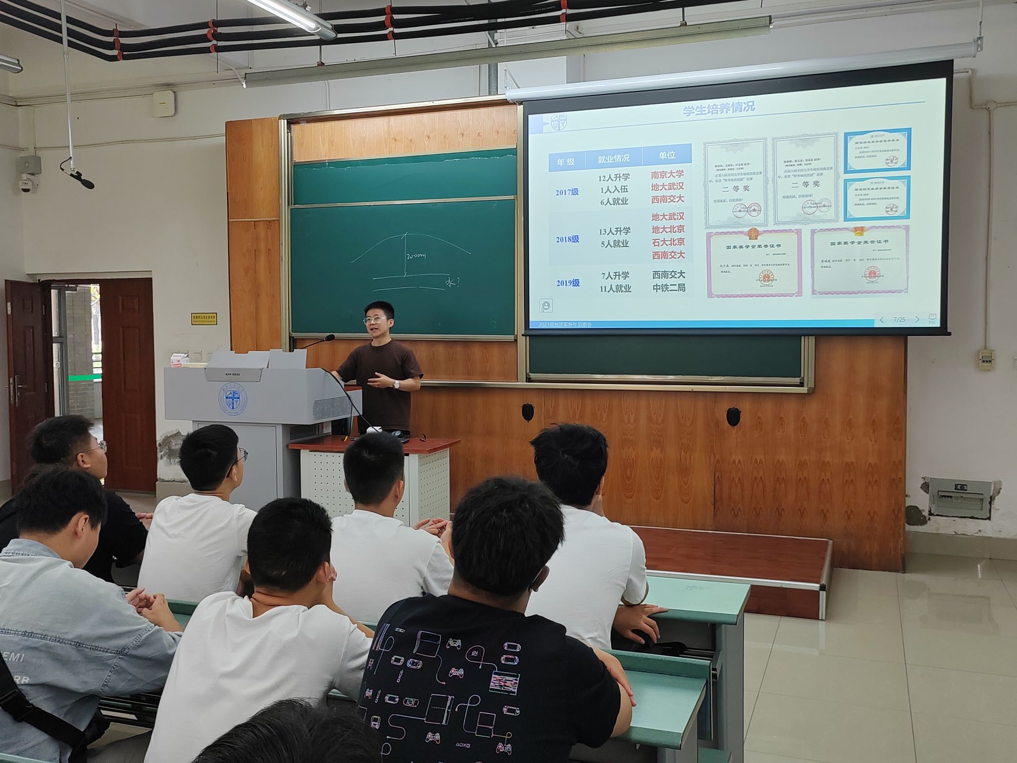 地质专业的赵晓彦老师和石宇老师为地质新生介绍了专业发展和学生培养情况等,毕业于地质专业的辅导员牛浩然老师通过自己的学习经历和职业规划引导新生积极思考未来发展。