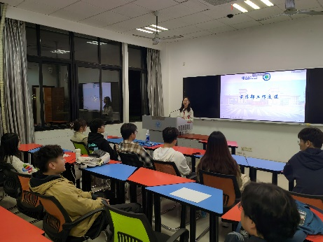 大会第一项议程是介绍会议主旨及整体工作的经验分享,由研会22级主席龚姝月向新任主席团及部长们详细说明了上一学年研会完成的主要工作内容和主要活动的时间节点。