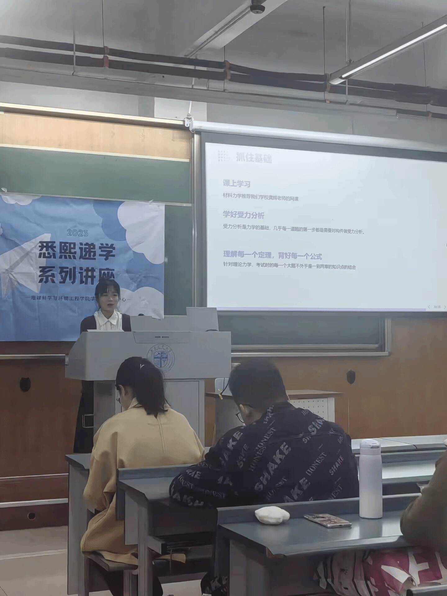 11月5日晚,由地学学院学习与科创中心主办的“悉熙递学”系列讲座第二场“学习经验大礼包”在犀浦校区X4156顺利举办。本次讲座旨在为低年级同学介绍重点公共基础课程及相关专业课程的学习方法,帮助同学们解答公共课、专业课的学习困惑。本次讲座我们邀请了2021级地理信息科学专业付政和2021级消防工程专业杜彦微两位优秀同学向相关专业同学做学习方法经验分享。