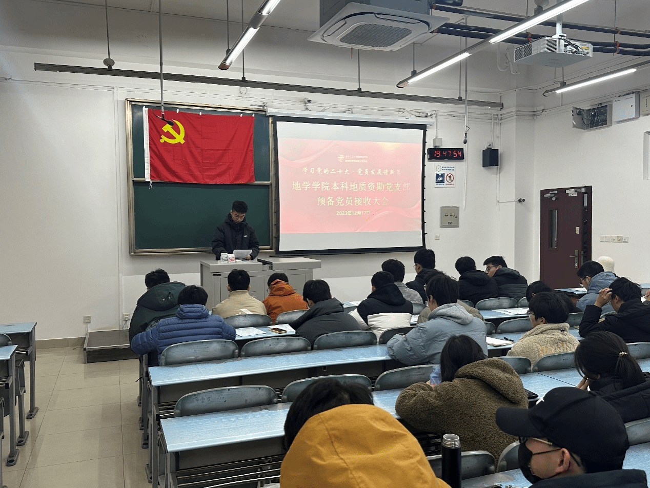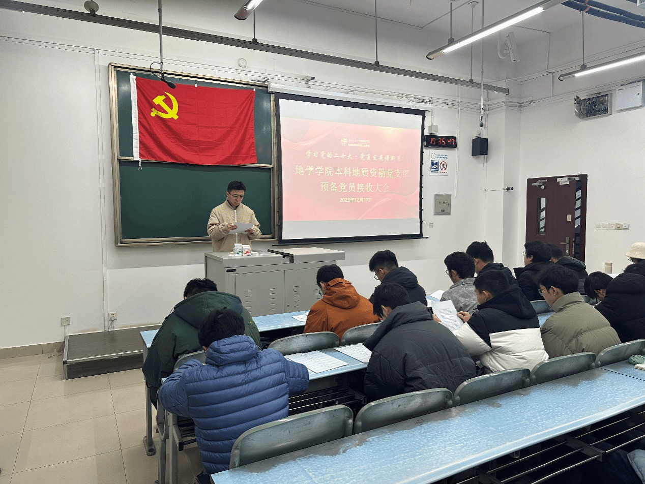 2023年12月8日19时30分,地学学院本科地质资勘党支部在X2220教室顺利召开预备党员接收大会,本次大会的议题:讨论是否同意接收刘宗旭、杨晨、林星杰、乔彦博、赵高伟、李骁群、王国英、廖望和朱梓宁9名同志为预备党员。会议由党支部书记薛怡然同志主持,支部正式党员应到会10人,实到会8人。