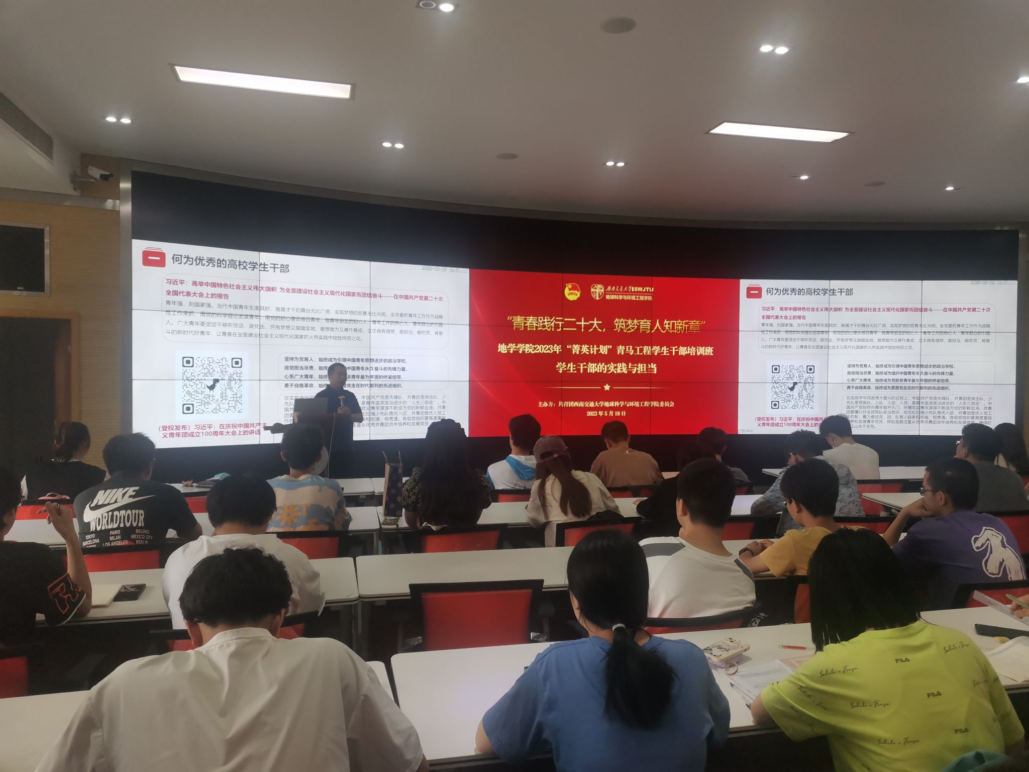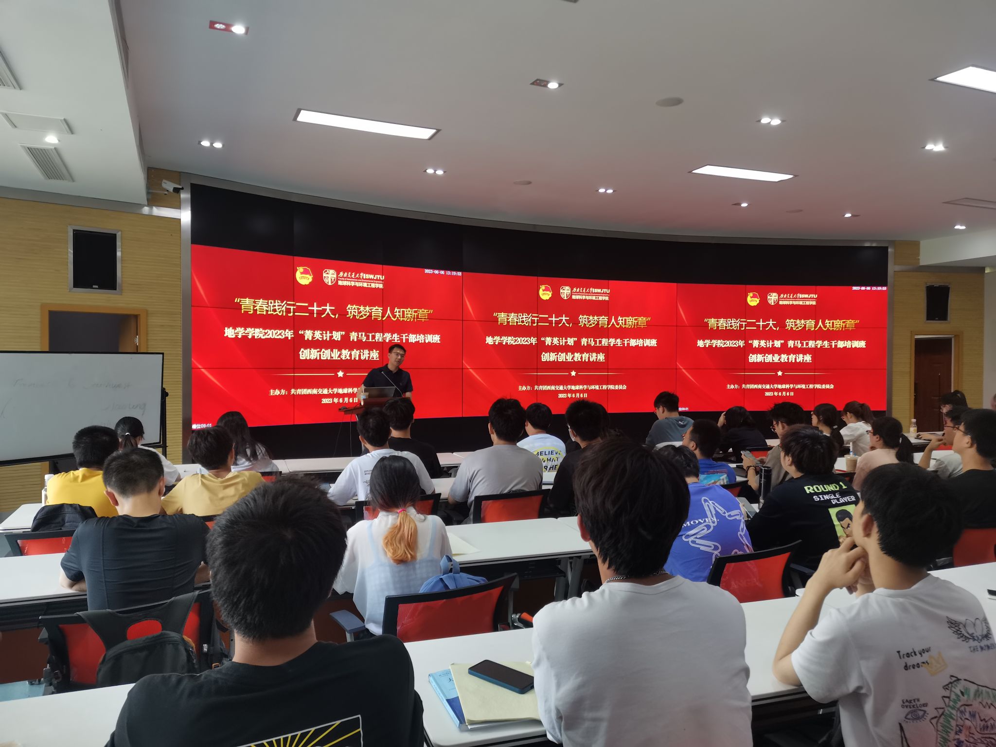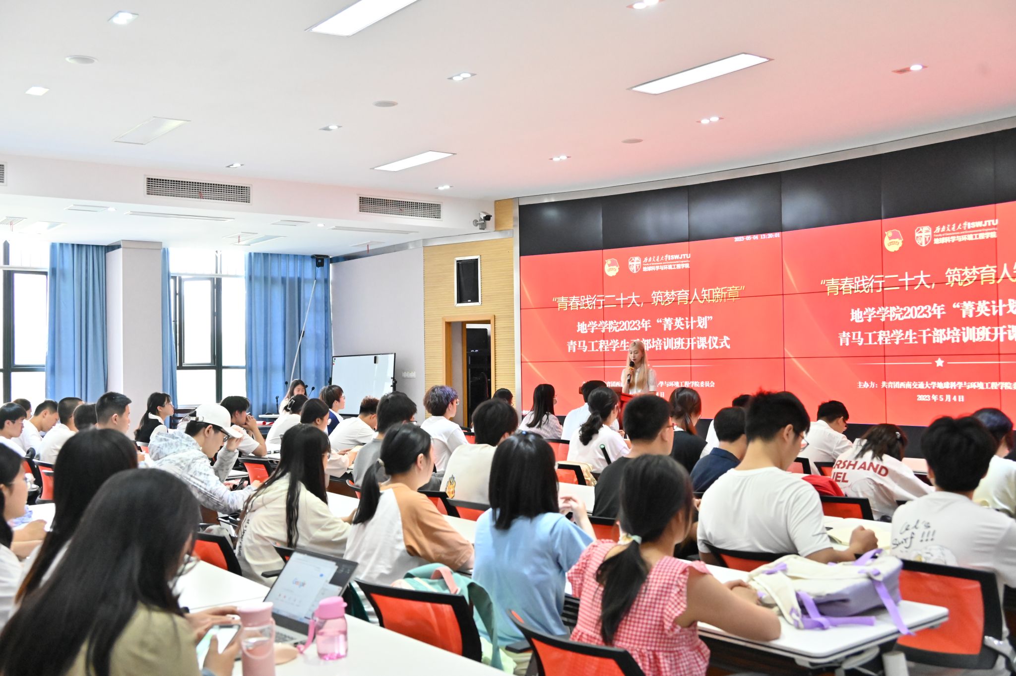 经前期学生组织报名推荐、学院团委资格审核,本次培训班共遴选43名学员。开班仪式于5月4日青年节在X4243举行,由地学学院学生会干事王馨溢主持。在开班仪式上,学院党委副书记郑波老师发表讲话,号召各位学员践行初心,担当使命,谨记习近平总书记所提出的“三个务必”,立志做有理想、敢担当、能吃苦、肯奋斗的新时代好青年,在专业学习、社会实践、学生工作等多个方面力争上游,为党和国家事业贡献更多力量。