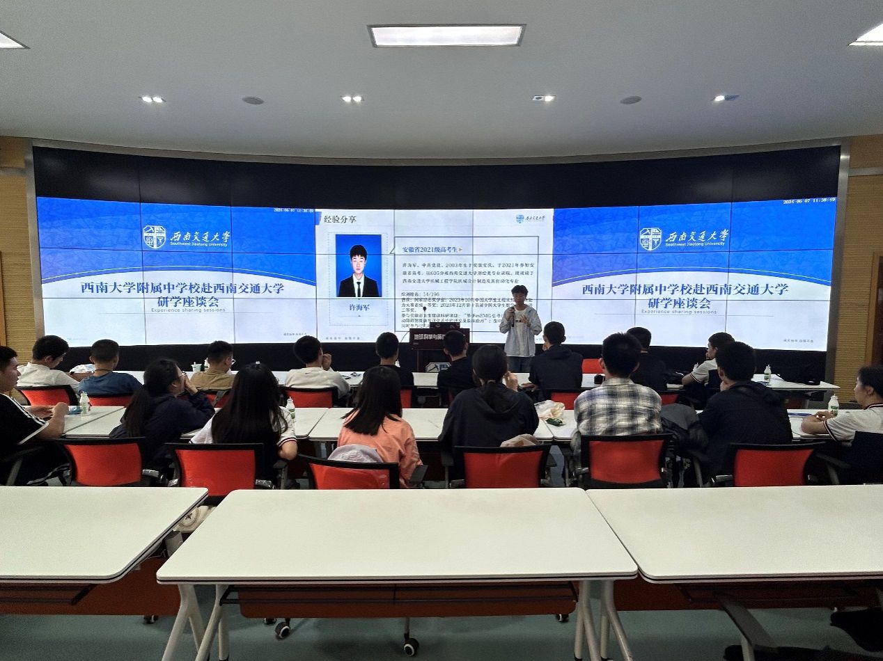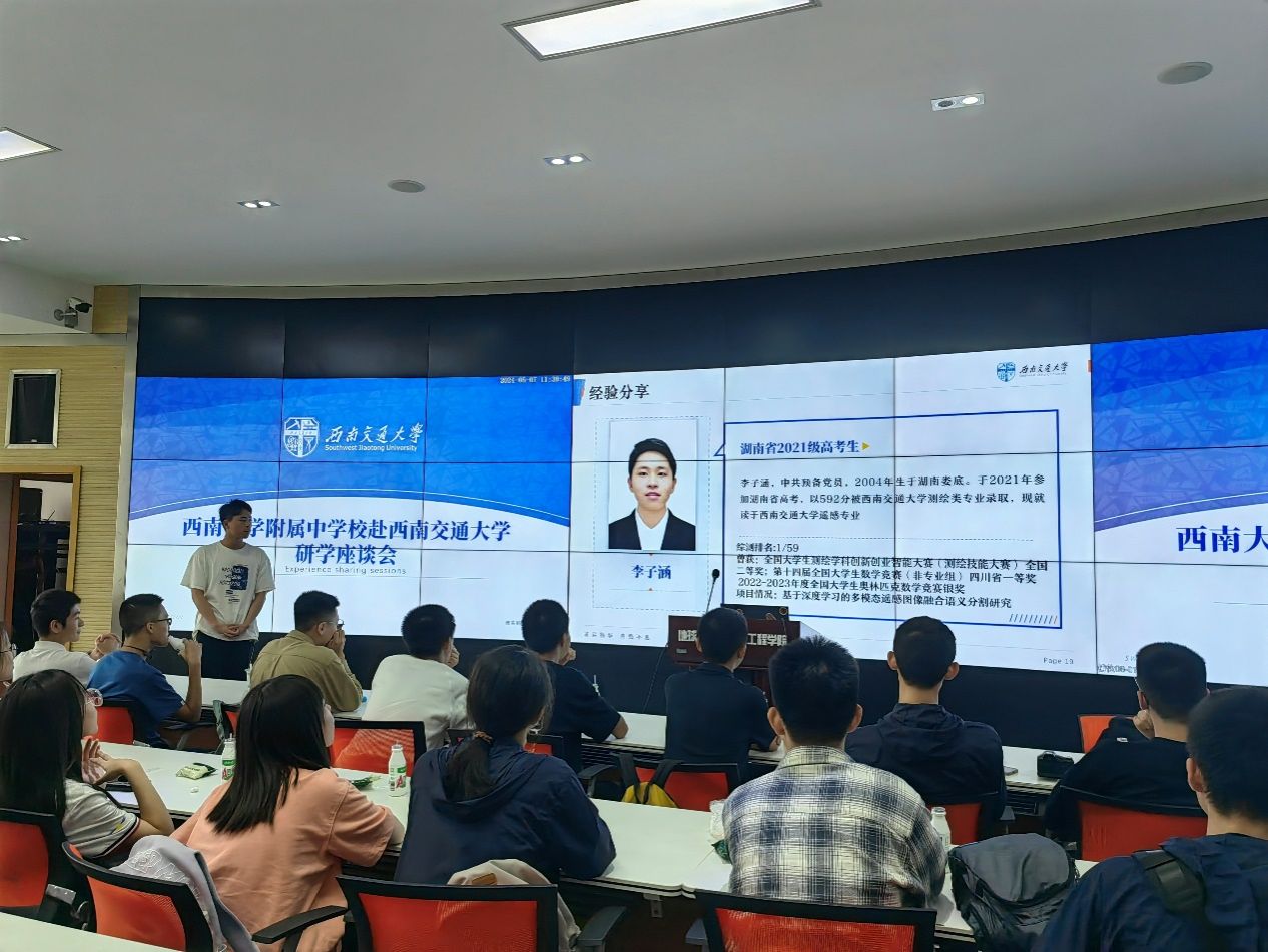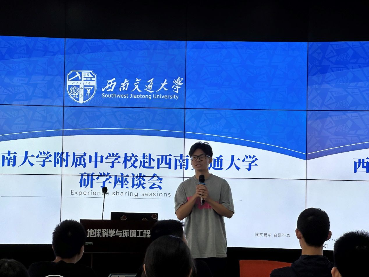 研学之旅最后,学院于X4243教室为西南大学附属中学师生开展优秀学长学习经验交流分享会。学院学生会主席团成员张熙从MBTI人格测试展开此次讲座,为同学们剖析了“兴趣与爱好”,强调了“让兴趣充斥职业生涯,让爱好装饰平淡生活”的理念。随后,本21级测绘工程专业优秀学生庞一帆、本21级遥感科学技术专业优秀学生李子涵、本21级机械设计制造及自动化专业优秀学生许海军依次发言,分别就高中学习技巧、大学学习方法、大学生活等方面同在场同学展开交流。