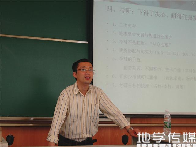 接下来,傅老师为在场的准毕业生们提点了大三学习生活的主要任务——系统学习知识纲目和目标职业的确定。他重点讲述了学生考研过程中的注意事项。他指出,考研心态的要求就是要下得了决心,耐得住寂寞,心无旁骛的学习。此外,大家一定要拒绝从众心理,量体裁衣,理性规划自己的发展轨迹。在选择学校的问题上,他指出,本校本学院具有一大批高水平、经验丰富的专家学者及优秀的博士生、研究生。因此,他鼓励大家积极努力考取本校研究生,继续为本校增光添彩。在选择就业的问题上,有仕途、商界和学术三个方向的职业规划,傅老师一一阐述了每个方向的毕业生职业专业所需的条件和要求。此外,他还通过自己朋友的经历告诫大家,在工作选择上要灵活多变,不要在一棵树上吊死。