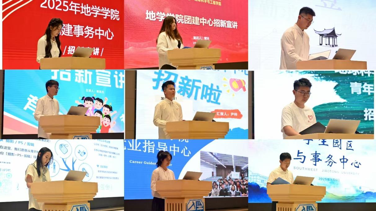 9月6日下午,地学学院2025年团学组织招新宣讲大会在犀浦校区“双一流”中心203报告厅开展。学院团委书记杨都强、团委副书记李婧、文强、胡佳慧、辅导员李林遥、吴有泰、黄欣宇、刘朝霞等老师出席了大会,与会者还包括各团学组织负责人及2025级全体新生。