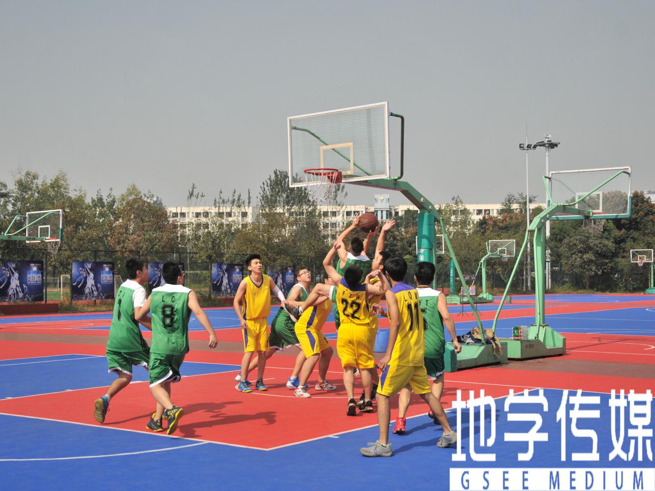 犀浦校区院系篮球赛决赛在北区篮球场打响,在充满激情的音乐声中,身穿红色球衣的地学学院队队员与身穿蓝色球衣的信息学院队队员登台亮相,每个队员都为了学院的荣誉而相互鼓励加油,个个整装待发。