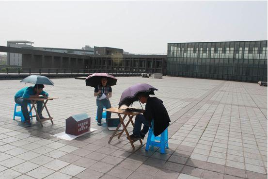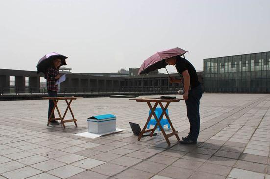 下午13:30,模型降噪效果测试在四教四楼天台正式开始。工作人员按照作品提交顺序,依次给作品进行测试。测试时发声器被置于模型内部,播放一定分贝值的工厂噪音声源,在模型一米开外分别放置有两个分贝仪。每次测试时间为五分钟,最终取平均值,这样就能较为准确的测出模型的降噪效果。为了不影响教室及办公室的工作,测试工作特地选择在天台。当天下午艳阳高照,天台楼板涌起阵阵热浪,工作人员顶着烈日一丝不苟的监测着测试仪器。
