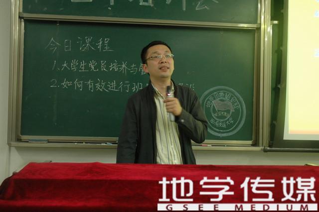 “大学生党员培养与管理”主题讲座的主讲人是地学学院党委副书记傅尤刚老师。讲座中,傅书记结合中央提出的发展党员十六字方针--“控制总量,改善结构,优化质量,发挥作用”,向大家介绍了“严把入口关,扎实抓好入党积极分子培养,夯实发展学生党员工作基础”、“严把质量管,严格标准,做好中选优,认真做好团内推优”这两方面内容。谈及大学生入党的规范性与制度性,傅书记说:“我们要严把入口关,要让同学们了解‘入党积极分子队伍建设的重要意义’、‘确定入党积极分子’、‘入党积极分子培养’、‘入党积极分子的考察’、‘入党积极分子党课培训’”。接着,在如何严把质量关方面,傅老师向大家介绍了“团内推优工作的重要性”、“推优对象及基本条件”、“推优入党的基本程序”、“推优入党的基本流程”、“推优入党的纪律”。