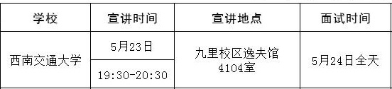 铁四院工勘院5月23日九里校区举办招聘宣讲会,5月24日全天在犀浦校区进行面试。