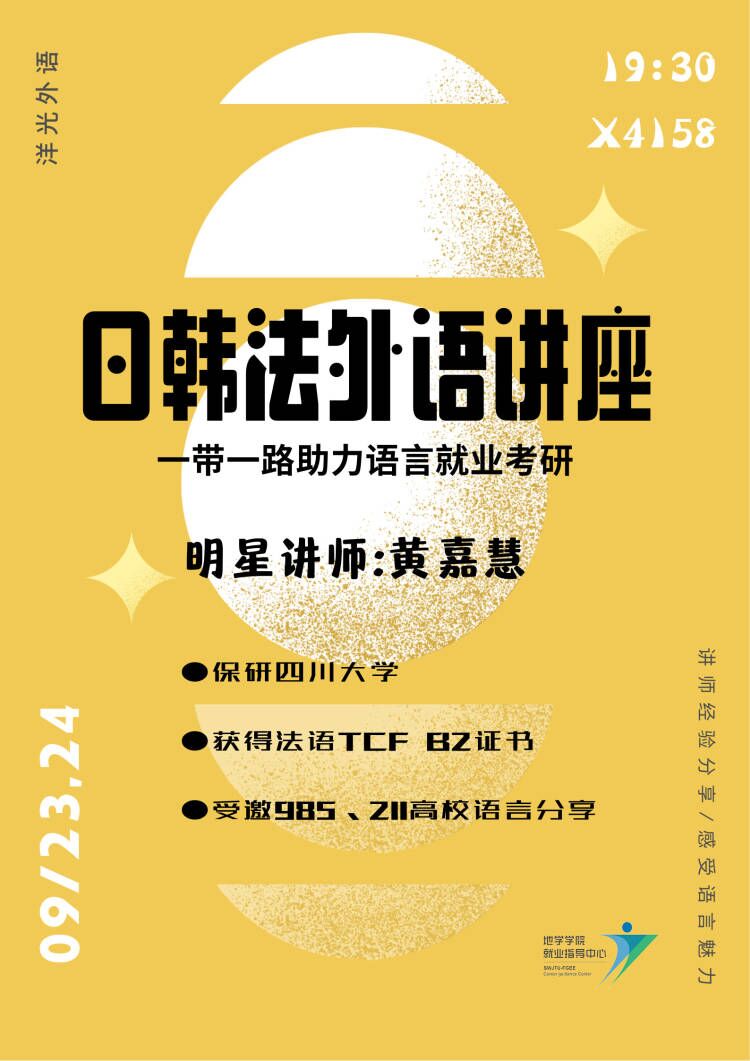 主讲人简介:大一西北大学周末开始学习法语,过分过四六级,大二在便学而思兼职英语老师,大三获得法语TCF B2证书 大四保研四川大学,已成为阳光教育集团明星讲师 毕业时受邀参加985、211高校语言分享。