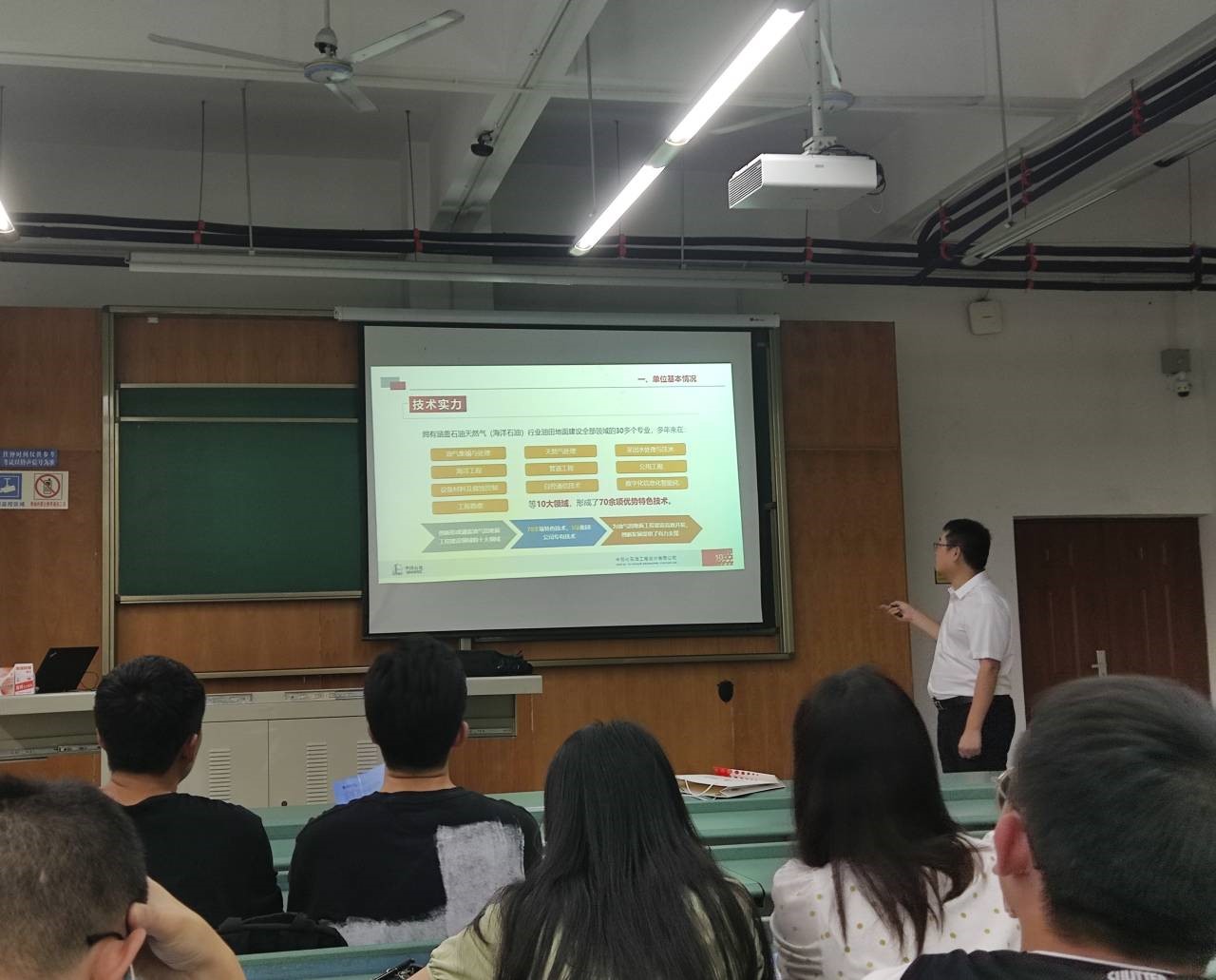 中石化石油工程设计有限公司首先介绍了公司的基本情况,包括公司的历史沿革、分子公司和联络点分布、市场范围、工作环境和技术实力等。然后介绍了公司的人才队伍,员工队伍素质较高,高端人才集聚以及较高的薪酬福利待遇。同时,也向在场同学介绍了公司的招聘要求、应聘流程及联系方式等,现场同学反响热烈。