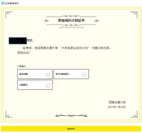 第七步:完成所有能力训练后,需要在“生涯档案证书”模块提交“生成证书”