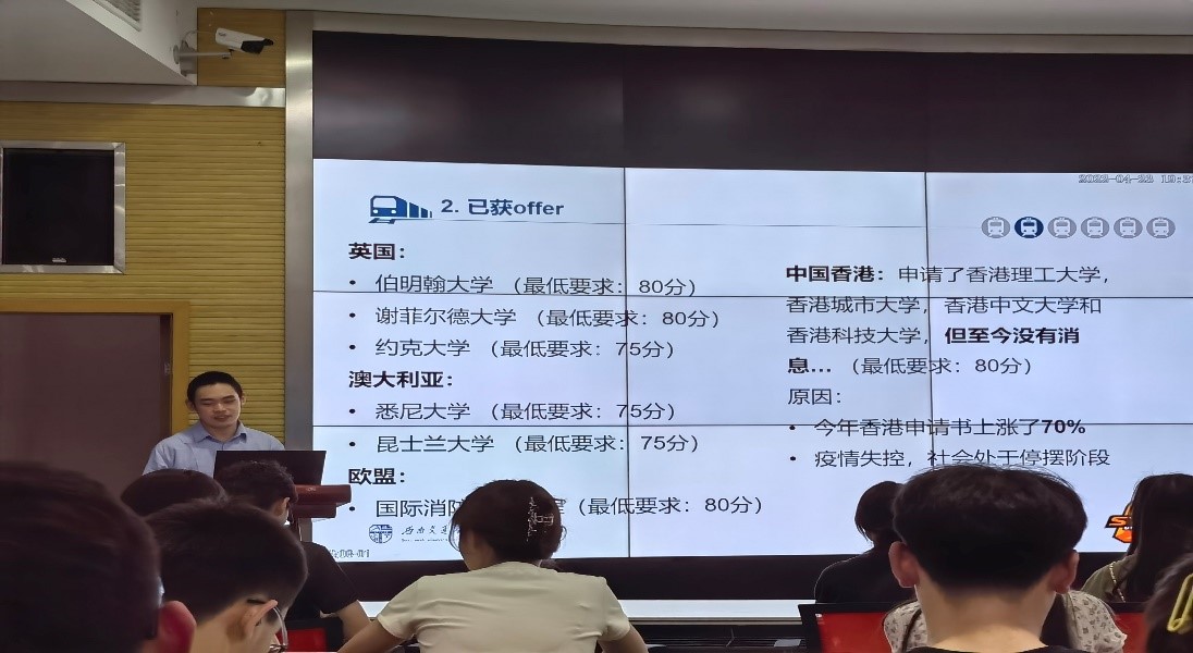 首先,萧琨铧介绍了自己所获的offer,并以此进行了院校介绍,介绍了各个学校的优势以及强势专业,通过分析这些学校,自己的考虑,说出自己的最终选择:国际消防安全工程硕士,并分析了IMFSE的授课结构,优点以及其缺点。