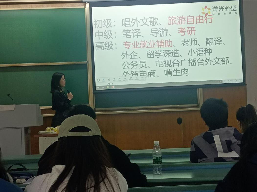 2023年4月6日下午,由地学学院就业指导中心主办的小语种留学系列专题讲座之“语言学习与大学生职业规划发展”在X4154顺利开展,本次讲座由洋光外语著名讲师孙静老师主讲。孙静老师擅长小语种的考研分析,为很多学习小语种的同学在考研和留学方面提供了建设性帮助。