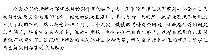 第二方面,看见不一样,才能做到不一样。在与他人相处的时候,我们往往以自己为中心去看待事情和思考别人的行为,认为别人这里有问题那里有问题,这样就很容易导致矛盾的产生。所以我们要改变固有的思维去思考和看待别人,看见不一样的别人,才会学会去包容和尊重别人。就如何去做到看见不一样,老师向大家介绍了一种方法,叫做五栏技术,让大家把对一件事儿的看法列出来,并分成五栏去进行思考,层层递进,在五栏中逐渐地把自己看待事情的思维进行转变,以更阳光的视角去看待。