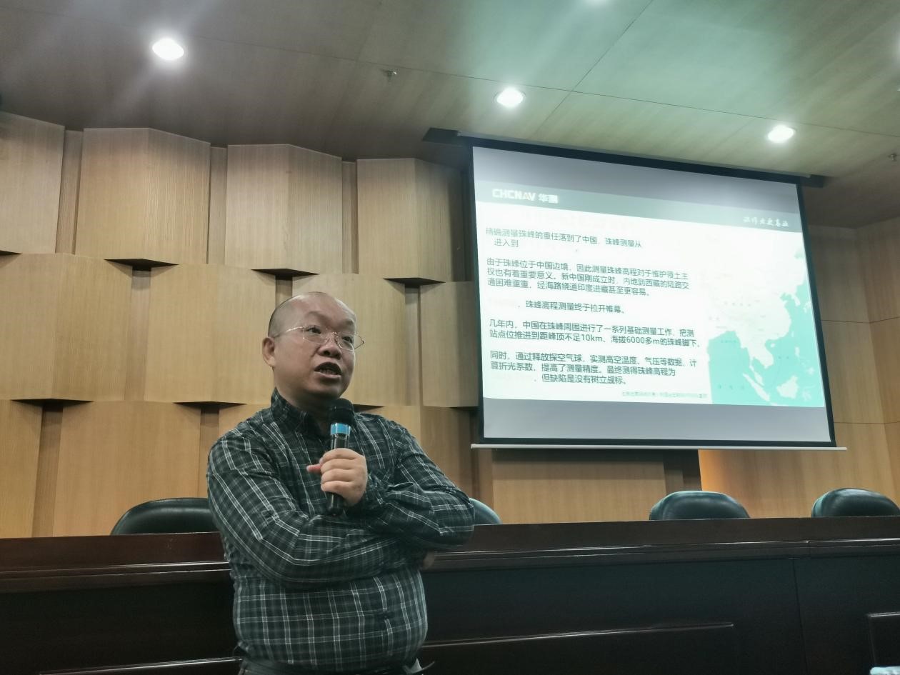 随后,由胡炜副总裁做讲座报告。报告中,胡炜副总裁就从为什么登顶珠峰、登顶珠峰并完成测量难度多大、登顶珠峰的测量设备条件如何、珠峰高度测量完成后带来怎样的影响等问题向同学们讲解。