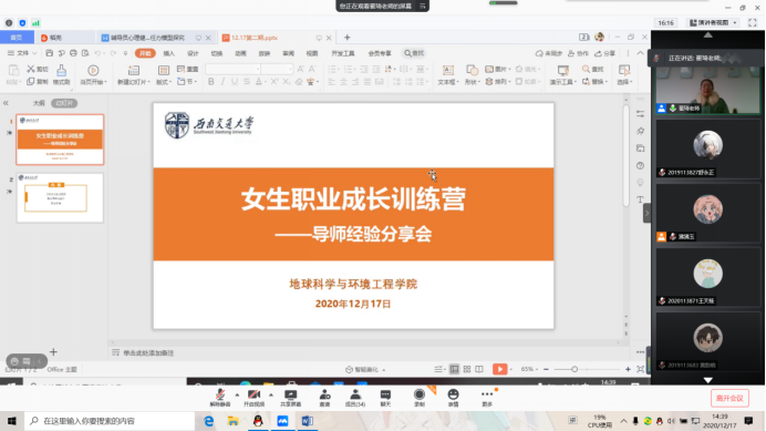 2020年12月17日14:30,地学学院就业指导中心“女生职业成长训练营”系列活动第二期——导师经验分享会在腾讯会议顺利举行。为积极响应学校防疫政策与要求,本次活动以线上会议的形式开展。活动由就业指导中心郑文娇老师主持,邀请到本17级毕业生辅导员翟琦老师做分享。